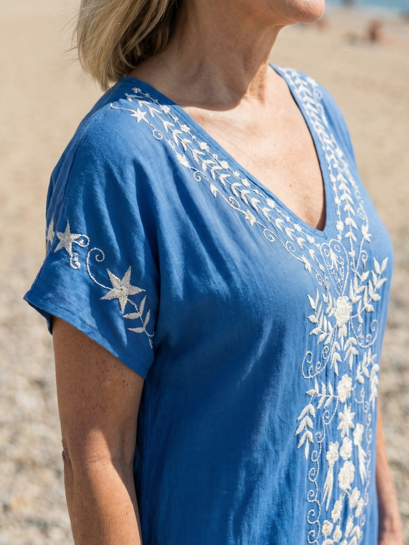 This dress is a short sleeve midi with a relaxed shape and detailed embroidery along the neckline and front. The fabric is lightweight and moves easily, offering comfort in warm conditions. It works well for everyday wear, especially in casual or travel settings.