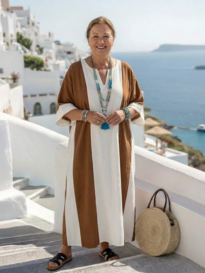 This dress features a loose, straight silhouette with soft color block panels that create a clean vertical line. The fabric is light and fluid, allowing for easy movement and all-day comfort. It fits naturally into warm weather and relaxed daily routines.