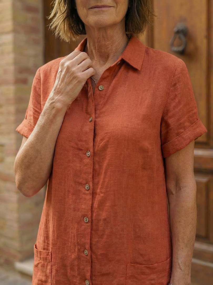 This dress is a simple button-front style with a relaxed shape and easy structure. The short sleeves and knee-length cut make it comfortable for warm days and everyday movement. It fits naturally into daily routines, offering a straightforward and practical option.