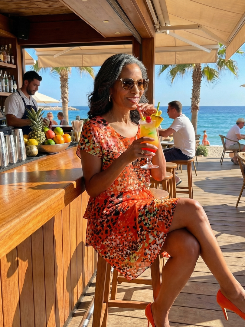 This dress features a scattered speckled pattern across a softly layered tiered silhouette that falls neatly along the body. The fabric feels light with a smooth drape, allowing for easy movement throughout the day. The relaxed fit supports everyday wear with a steady and composed feel.