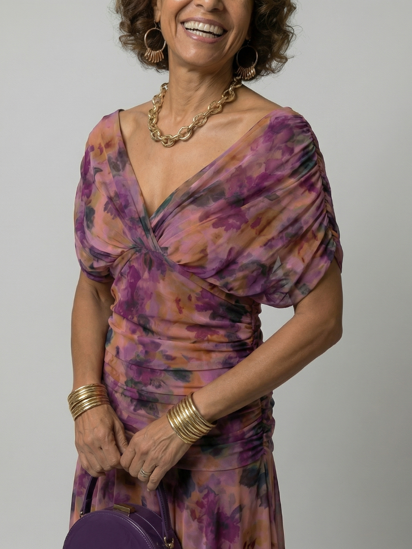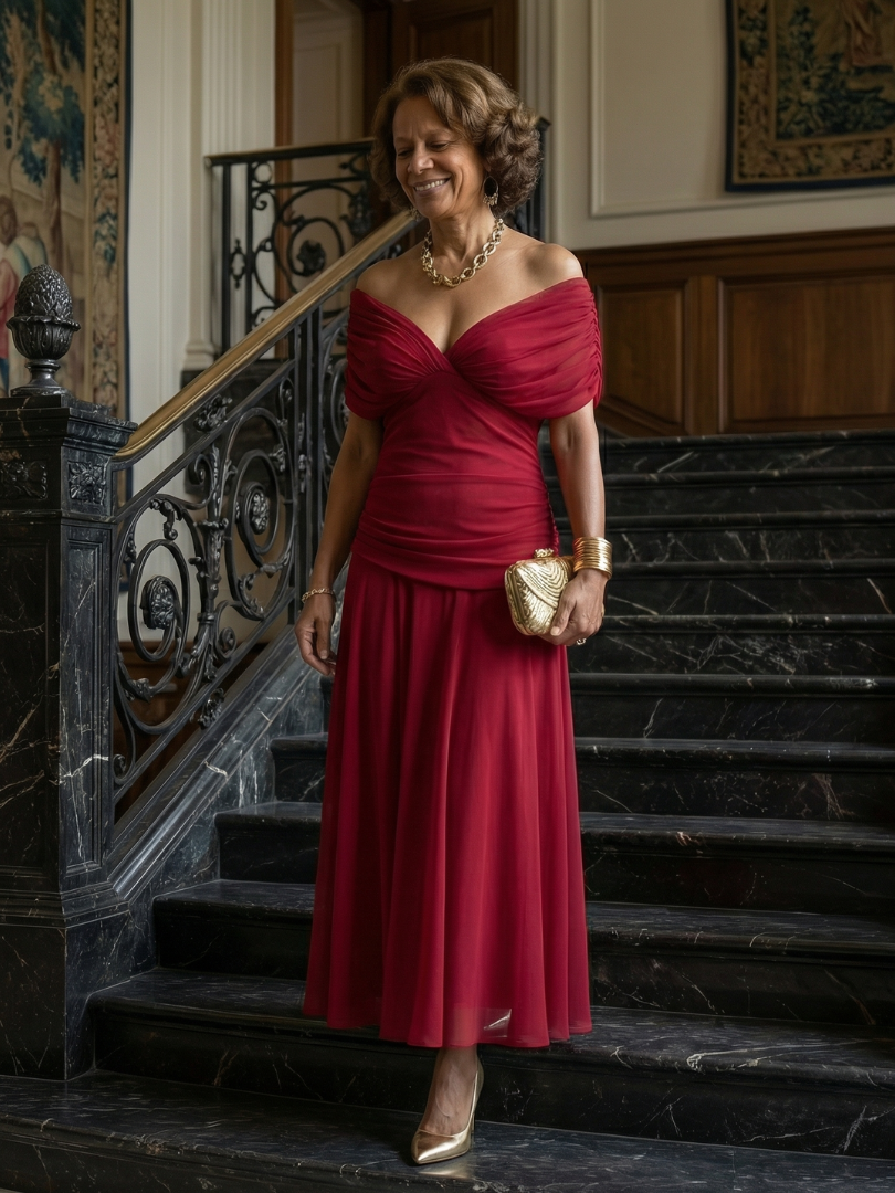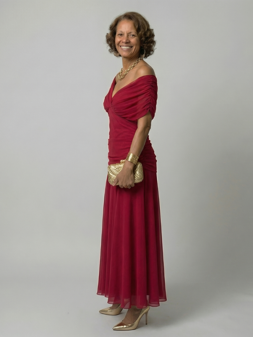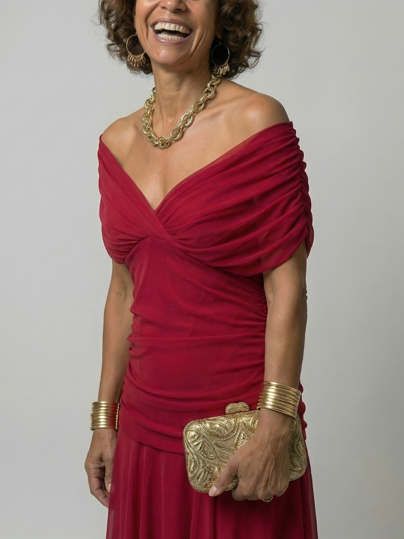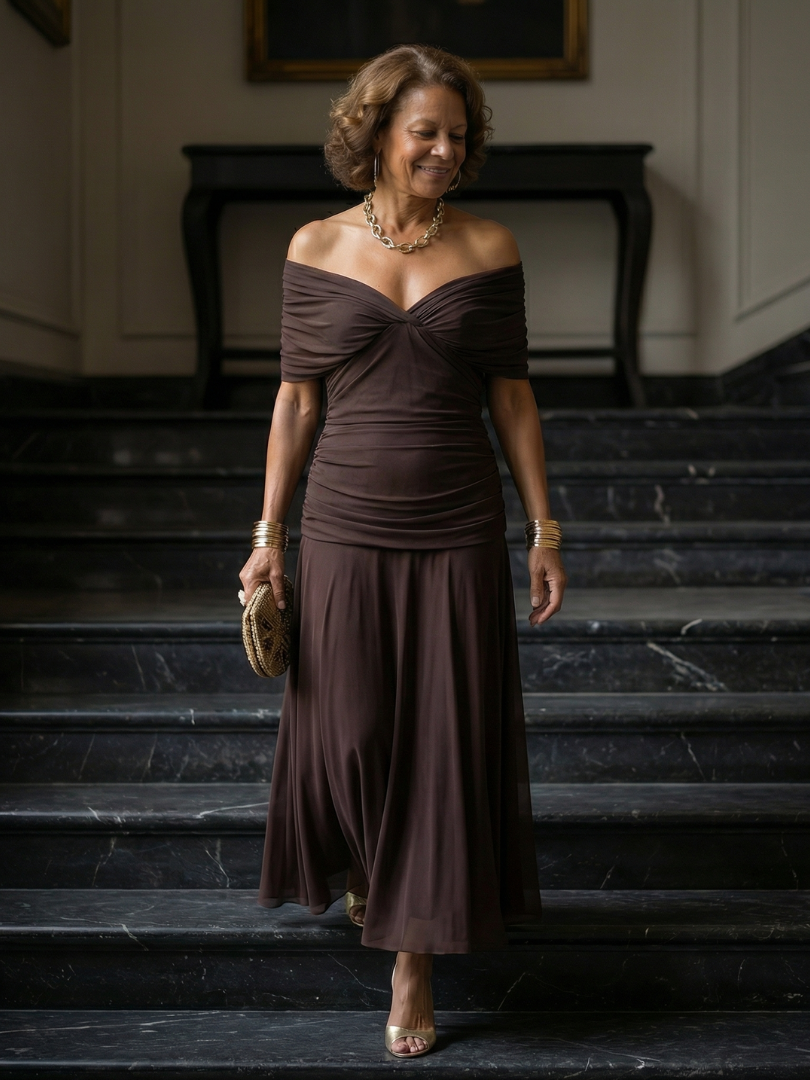 This dress is an off shoulder midi with a draped neckline and a gently flared skirt. The fabric is lightweight and moves easily, allowing for comfort throughout the day. It works well for warm days or relaxed outdoor settings.