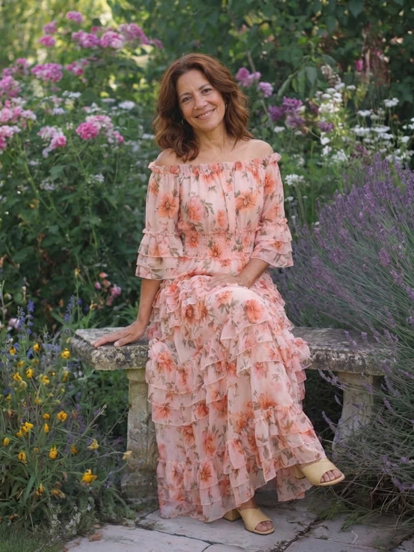 This dress features a floral pattern with an off shoulder neckline and layered ruffle design. The fabric is light and airy, creating soft movement with each step. It works well for warm days, casual outings, or relaxed gatherings.